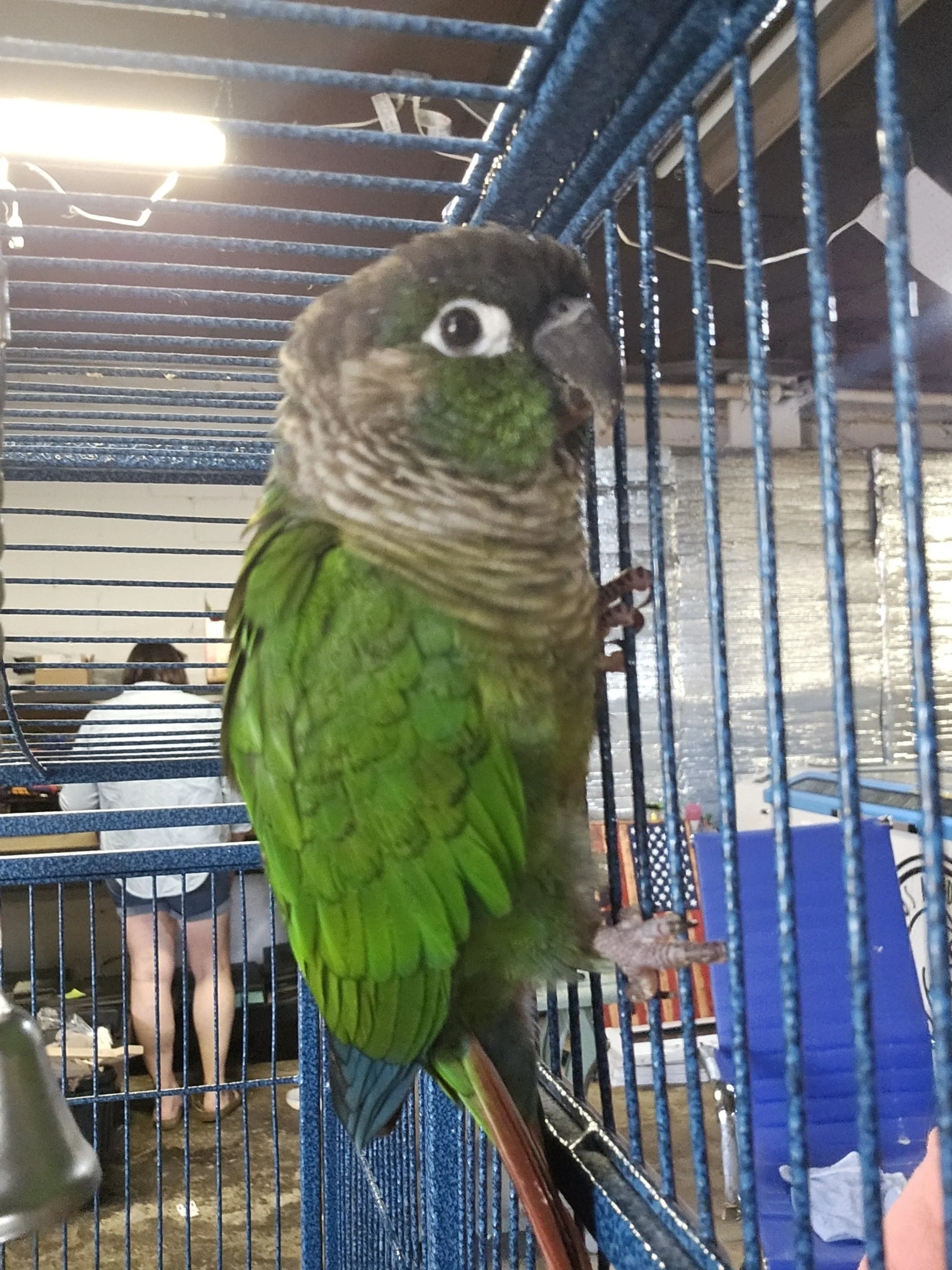 Dennis is a green cheek conure who came to us through animal control, so we do not have any background information about him. What we do know is that he is a social little guy who enjoys spending time with people. Dennis can be a bit hand shy, but once he feels comfortable, he loves hanging out on and with people. Like most conures, he has a curious and playful personality, and he would thrive in a patient home where he can continue to build trust and confidence. With the right care and attention, Dennis has the potential to become a wonderful companion.