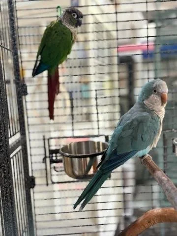 Homer is a 6-year old Green Cheek Conure and Gus is a 5-year old Quaker. Both are healthy, happy birds who have been well cared for and loved. Homer enjoys toys and keeping busy, while Gus is quite the talker and loves to chat. They are not birds that like to be handled, but they do enjoy being around people and spending time nearby.