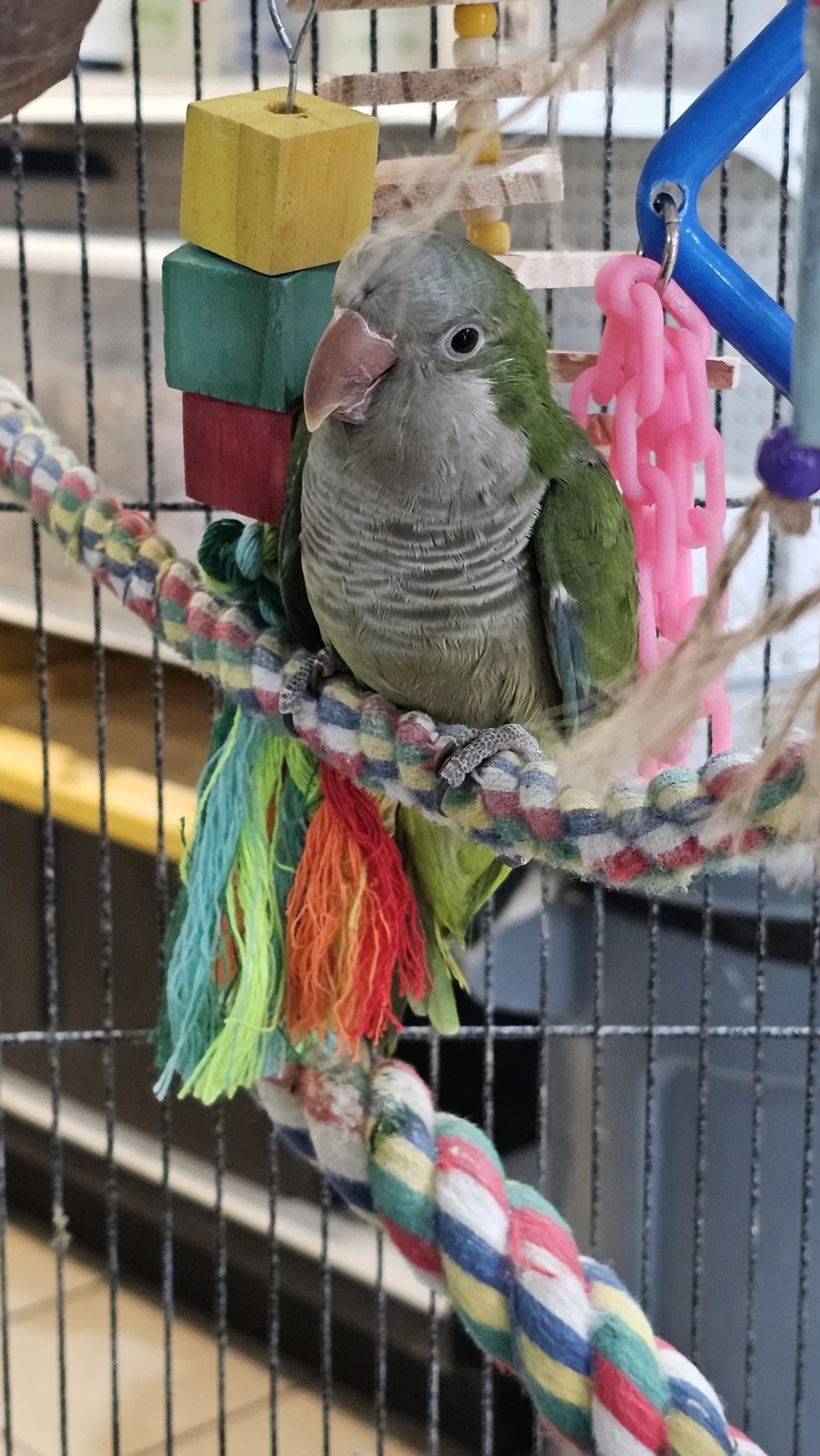 Hi there! I’m Max, a playful and curious Quaker Parrot with a love for flying, climbing, and finding the most interesting spots to land.